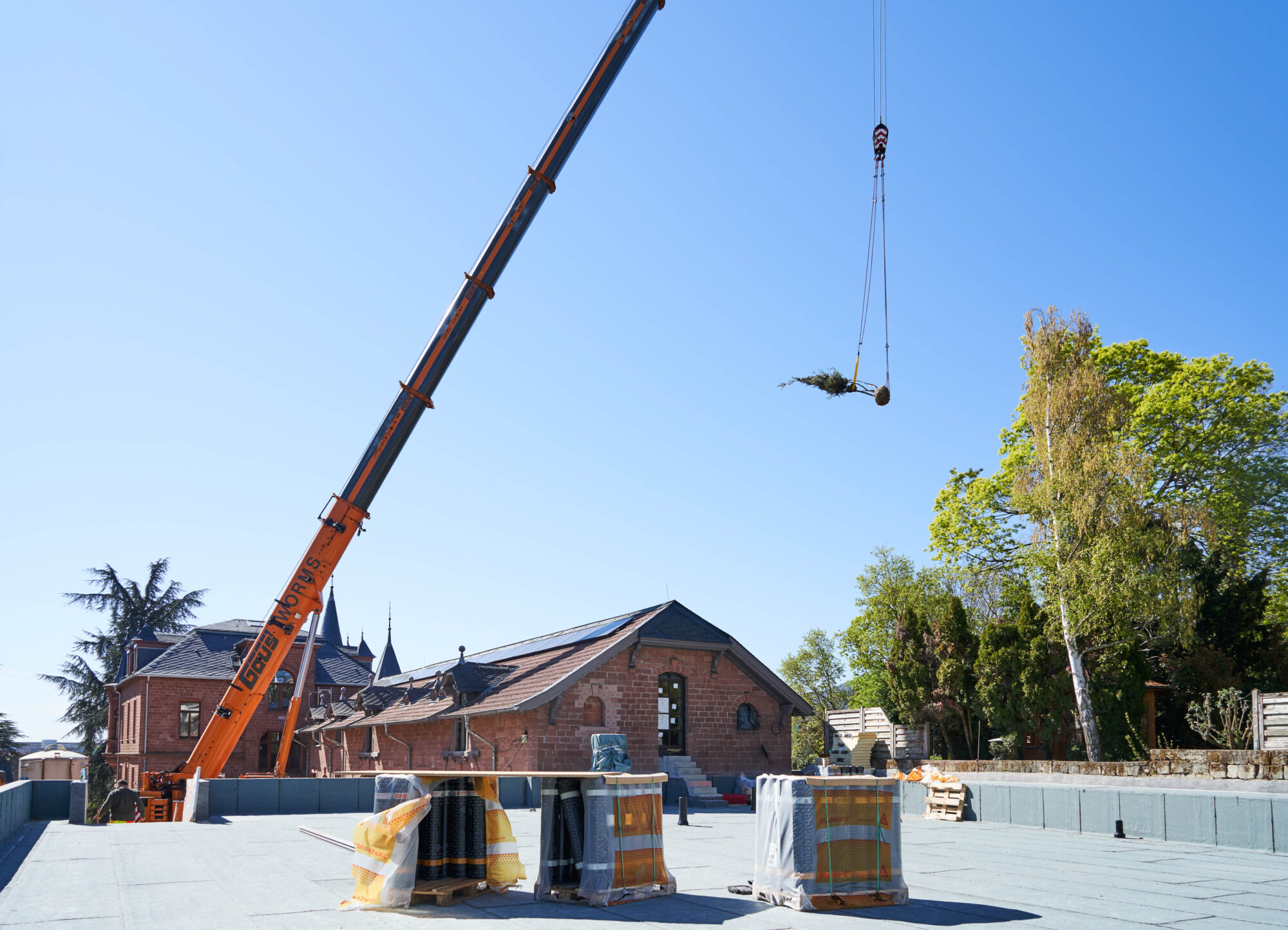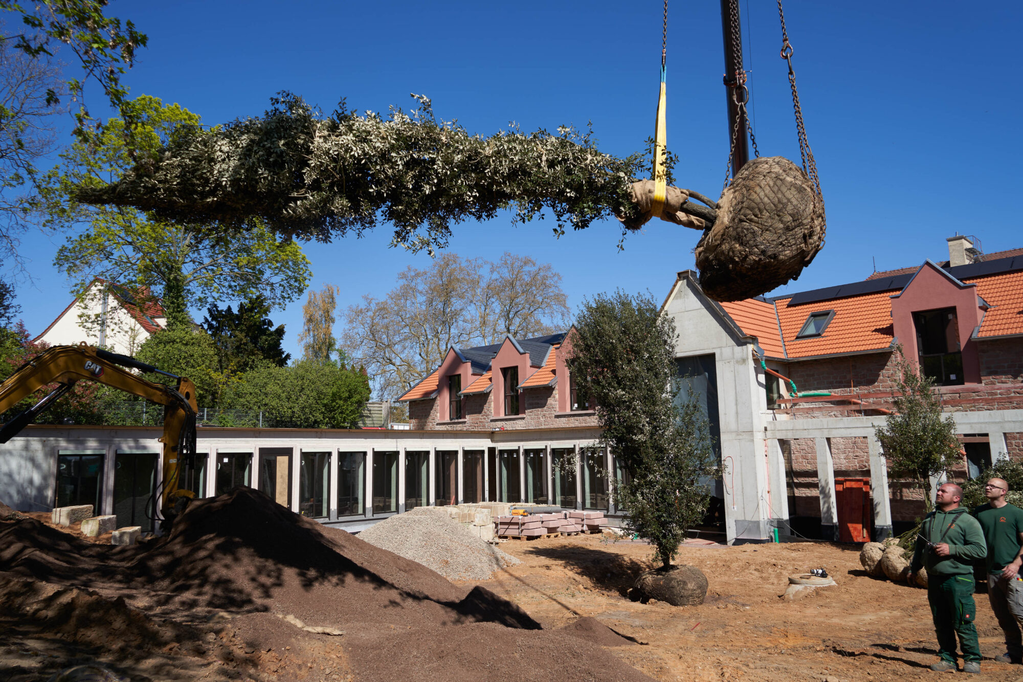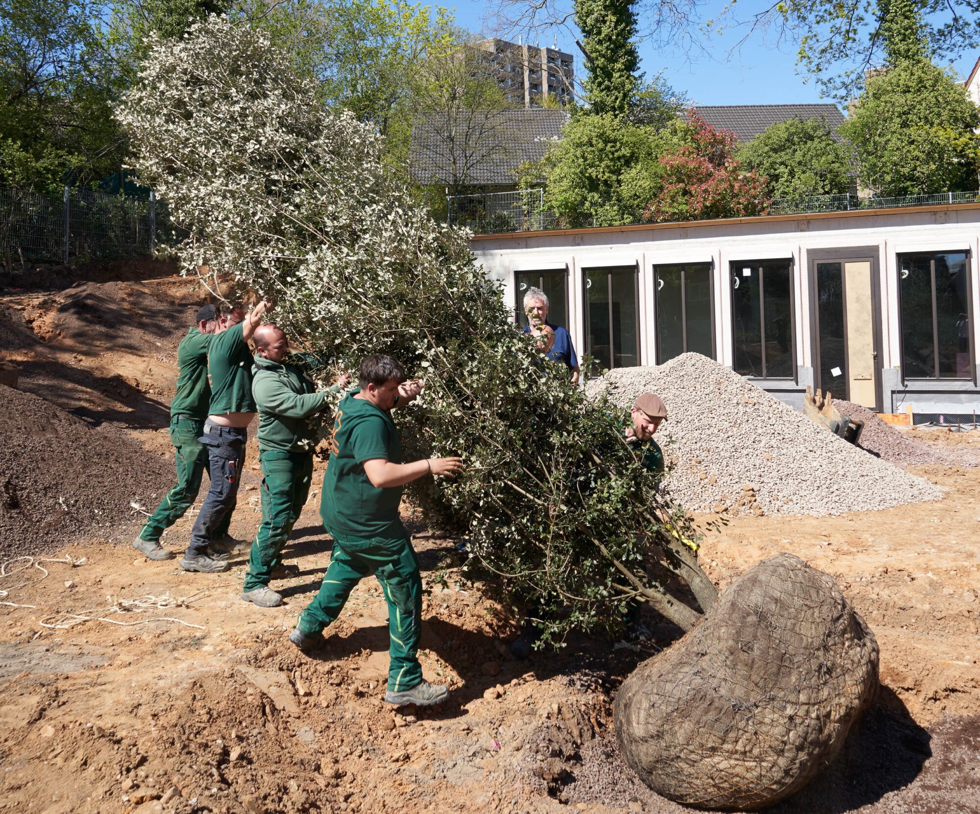 Die Anlieferung und Platzierung der Bäume war ein eindrucksvoller Moment. Während kleinere Exemplare zügig per Kran über das Dach der Remise gehoben wurden, stellte der Transport der großen Steineichen höchste Anforderungen an Präzision und Teamarbeit. Mit einem Gewicht von über zwei Tonnen wurden sie exakt an ihren vorgesehenen Standorten positioniert – ein sichtbares Zusammenspiel von Technik, Planung und handwerklicher Expertise.