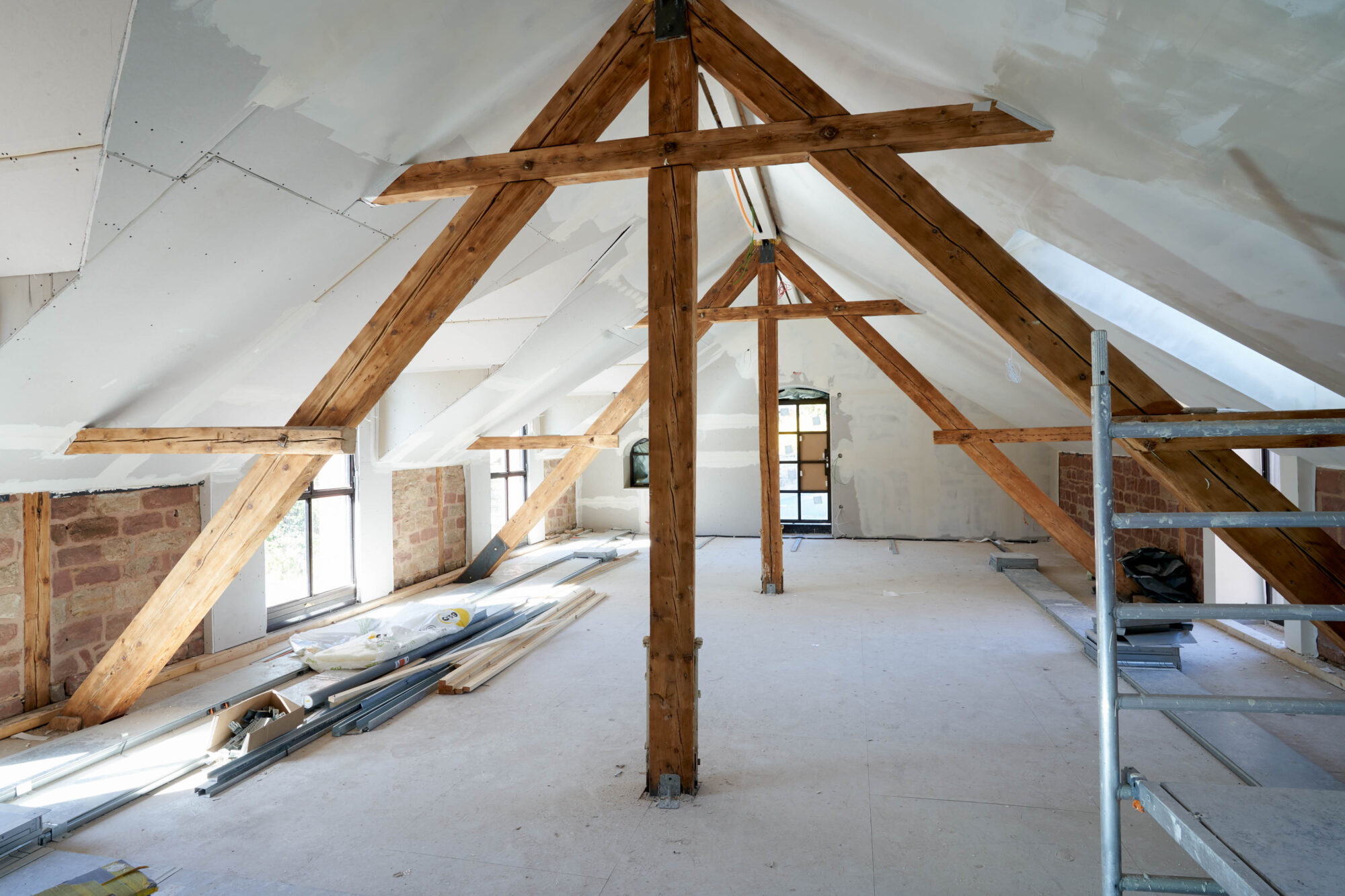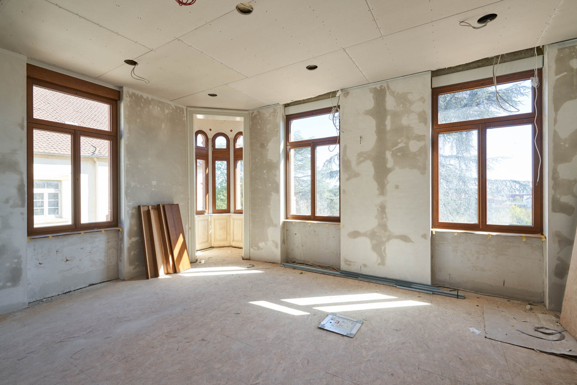 Auch im Innenbereich schreitet das Projekt planmäßig voran. Hochwertige Eichenfenster in der Villa setzen warme, prägende Akzente, während die markanten Stahlfenster in der Remise den architektonischen Charakter unterstreichen. Parallel dazu nimmt die aufwendige Restaurierung der historischen Sandsteintreppe zunehmend Form an.